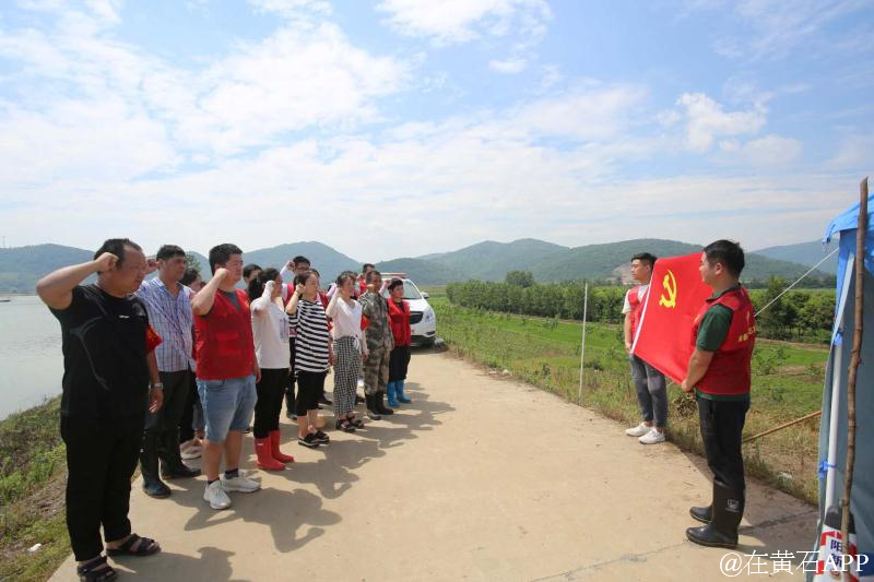 2020年7月12日上午,烈日下,阳新县富河宝塔湖13号堤坝,大家举起右手,庄严向党旗宣誓。随后,20多名党员志愿者沿着大堤巡堤查险,清除杂草、垃圾。