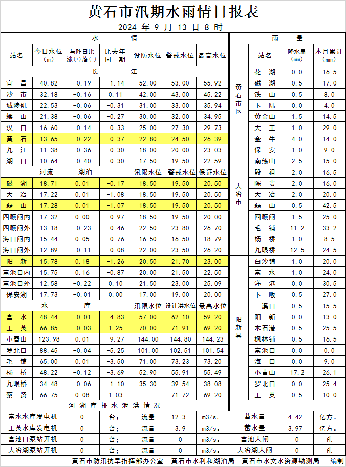 2024年9月13日水雨情日报表
