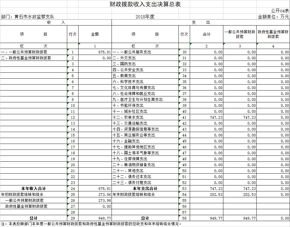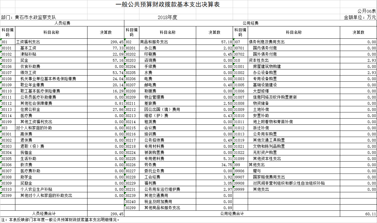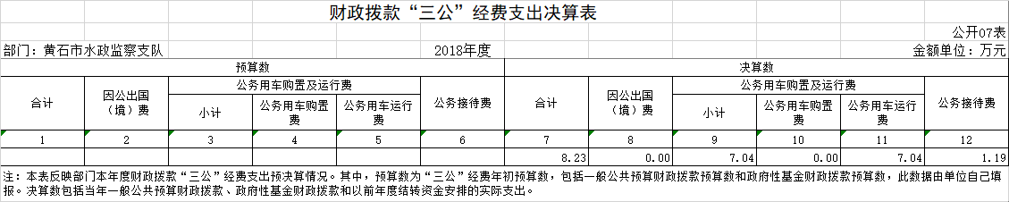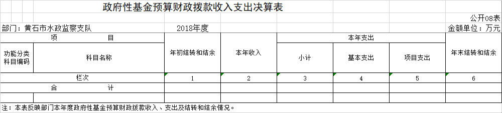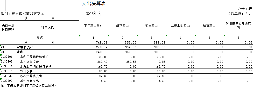 按照市财政局《关于做好2018年度市级部门决算信息公开工作有关事项的通知》(黄财库发〔2019〕202号)要求,现将黄石市水政监察支队2018年度部门决算公开情况说明如下。