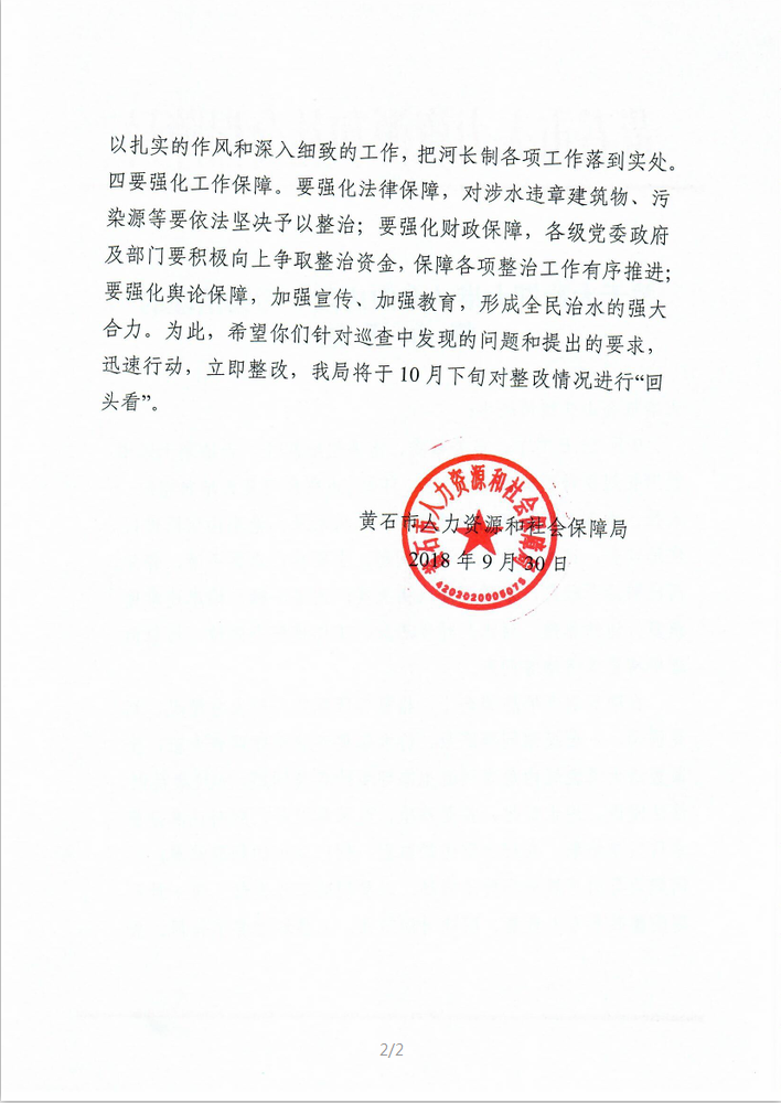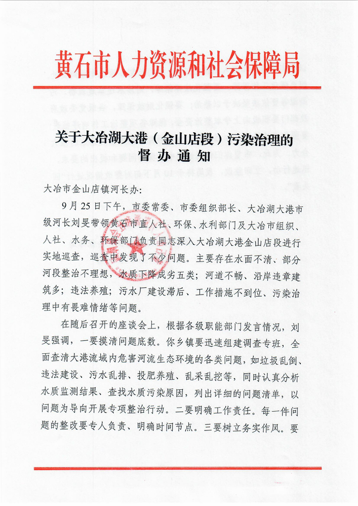(市人社局)自推行河湖长制工作以来,黄石市人社局坚决贯彻落实打好污染防治攻坚战决策部署,全面履行河湖长制督导部门责任,推动了大冶市大冶湖大港流域34公里长的干流督导治理,初步实现了“水清、河畅、岸绿、景美”。已督导大冶湖大港流域6个乡镇(办)收回养鱼水库25座,清理拦网捕鱼100多处,拆除禽畜养殖场所50多处,大港流域劣五类水质由初始30个减少到2个,污染治理成效明显。
