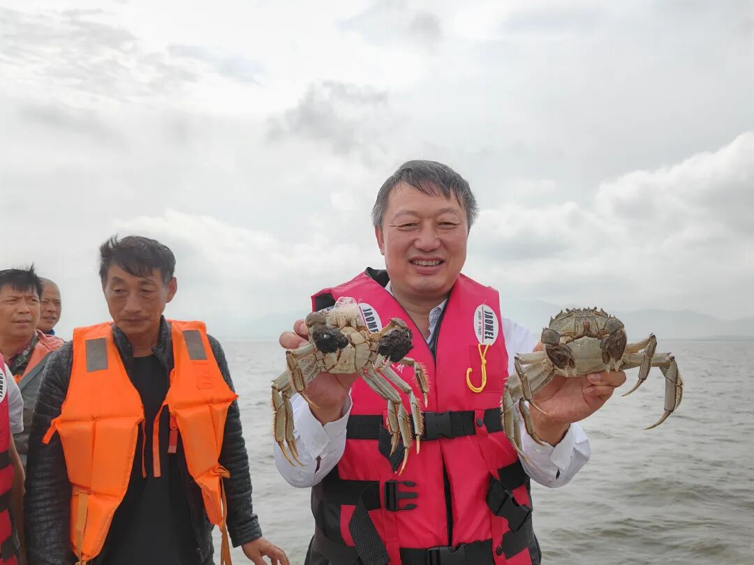 在华中农业大学水产学院副院长马徐发(右)的支持下,2024年首次放养的大冶湖“八月膏"长腿蟹喜获丰收。记者高喜明 摄