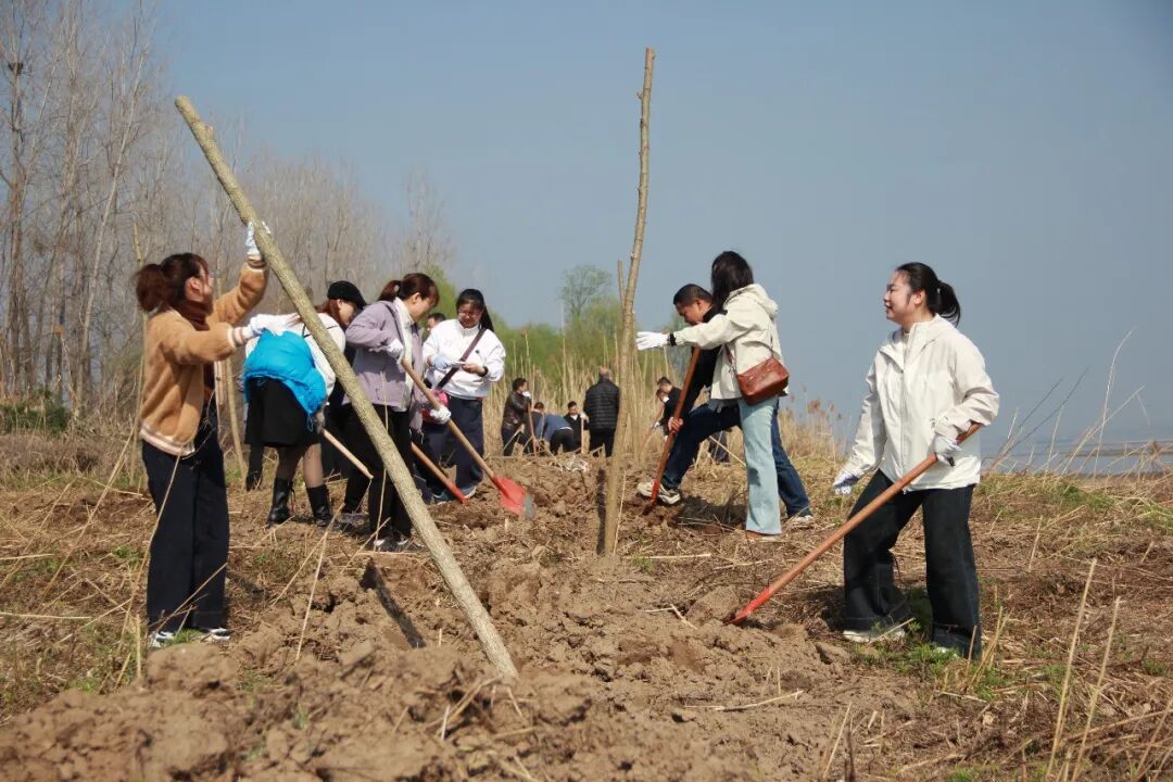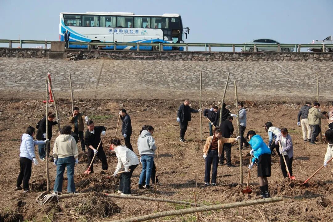 春风拂面,江景如画。植树现场一派热火朝天的忙碌景象,大家热情高涨、干劲十足,三五成组、分工协作。挥锹挖坑、扶苗正干、培土压实、提水浇灌,每一道工序都细致认真、有条不紊。经过一上午的齐心奋战,一排排新栽的树苗迎着江风挺立,错落有致、生机盎然,为春日的长江干堤合兴堤披上清新绿装,也为筑牢防洪生态屏障添上了坚实一笔。