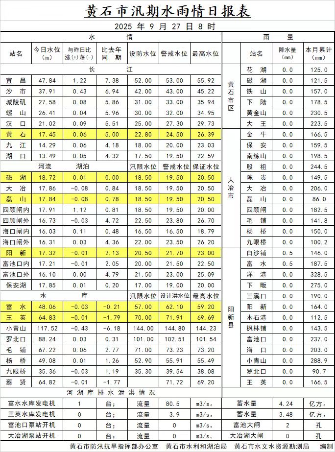 2025年9月27日水雨情日报表