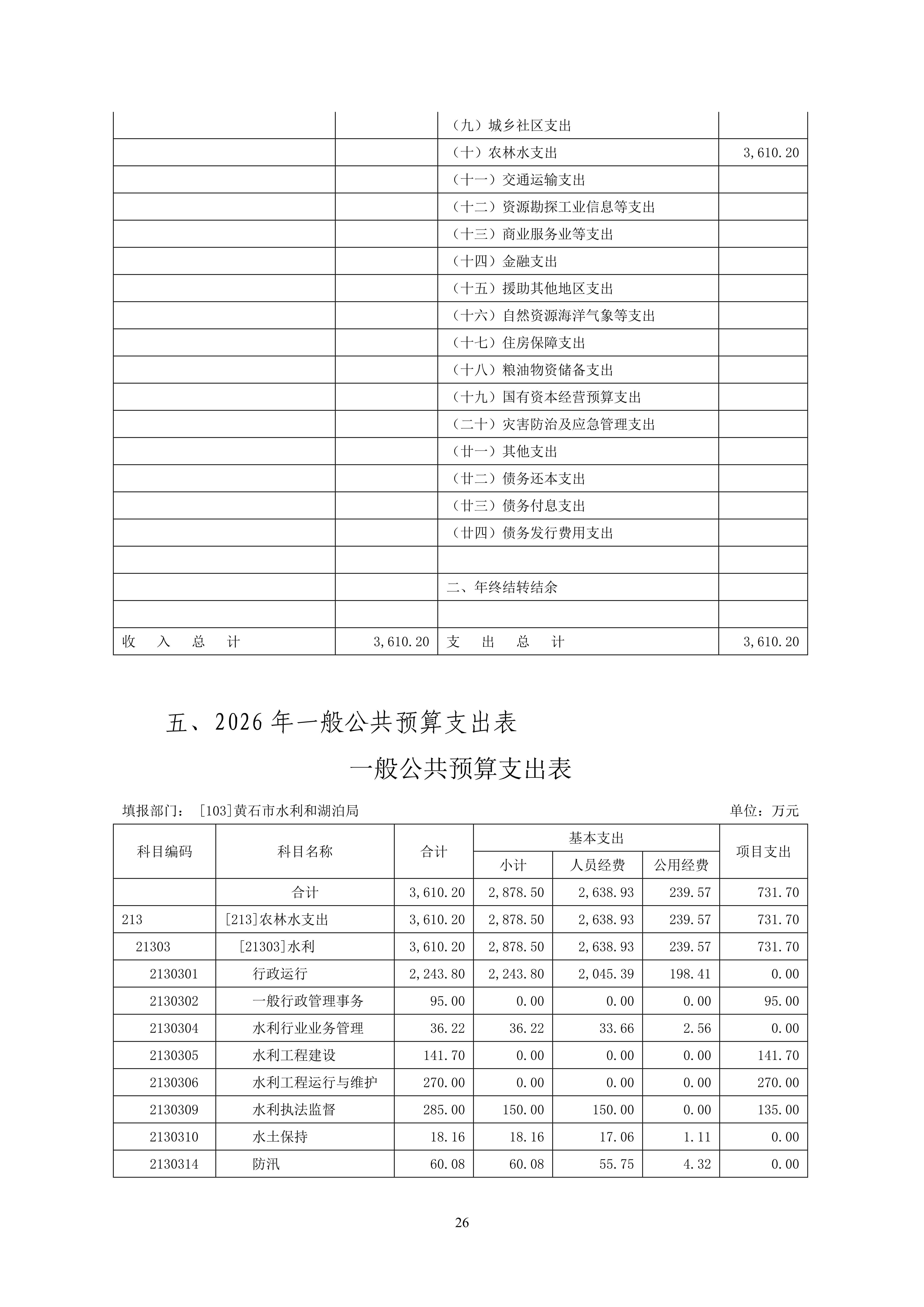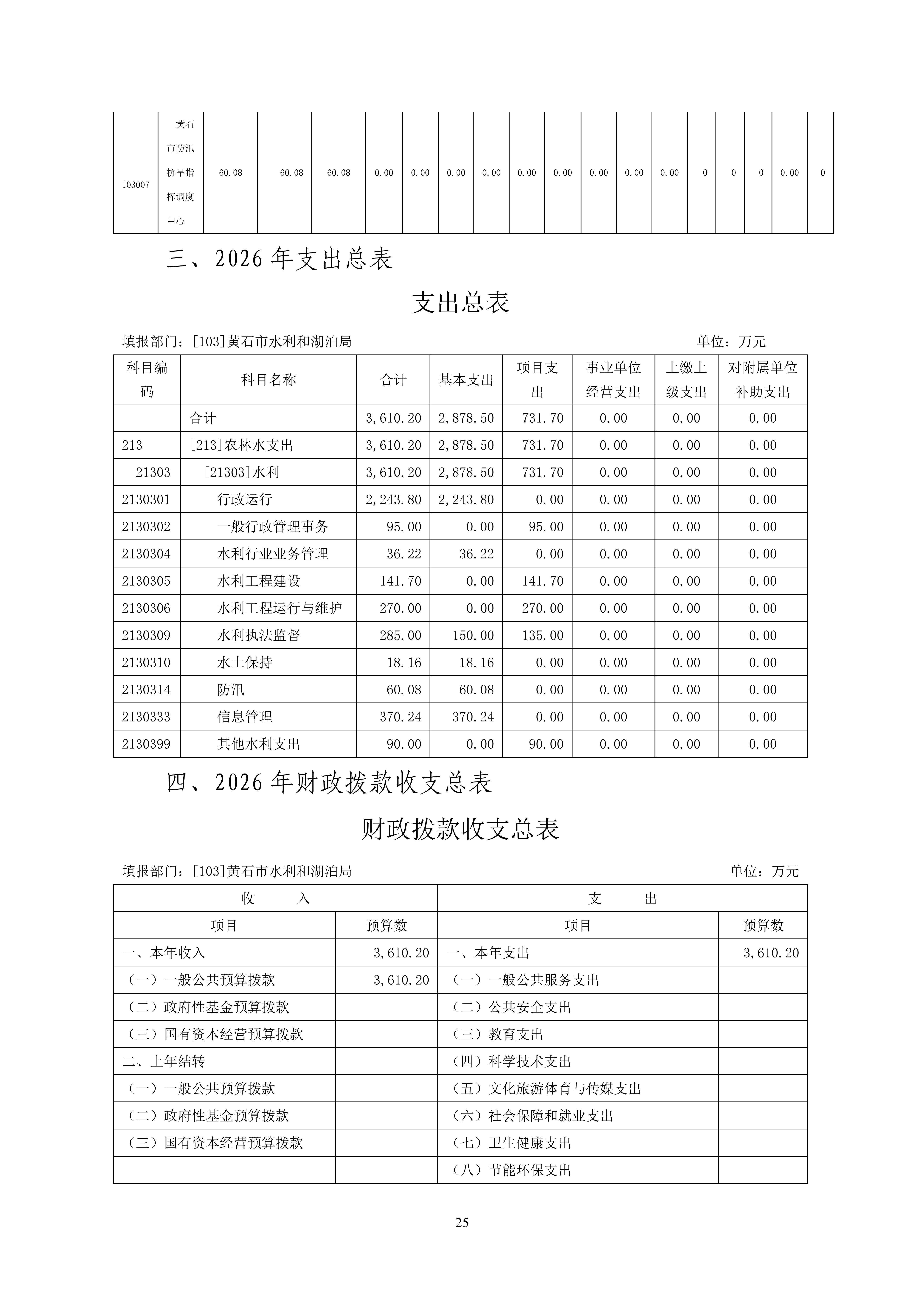 按照综合预算的原则,黄石市水利和湖泊局(汇总)所有收入和支出均纳入部门预算管理。收入全部为一般公共预算拨款收入;支出全部为农林水支出;2026年度收支总预算3610.20万元。