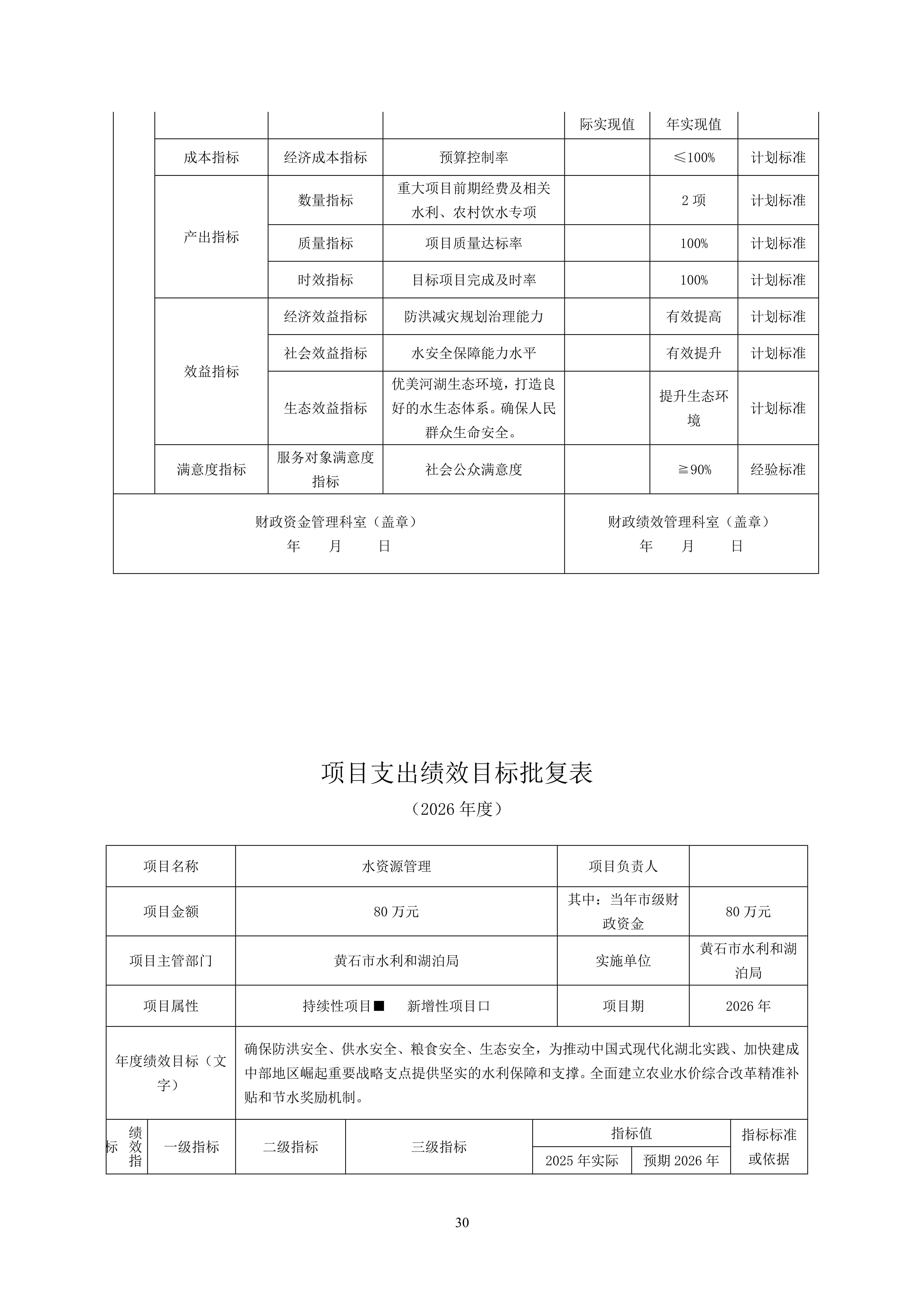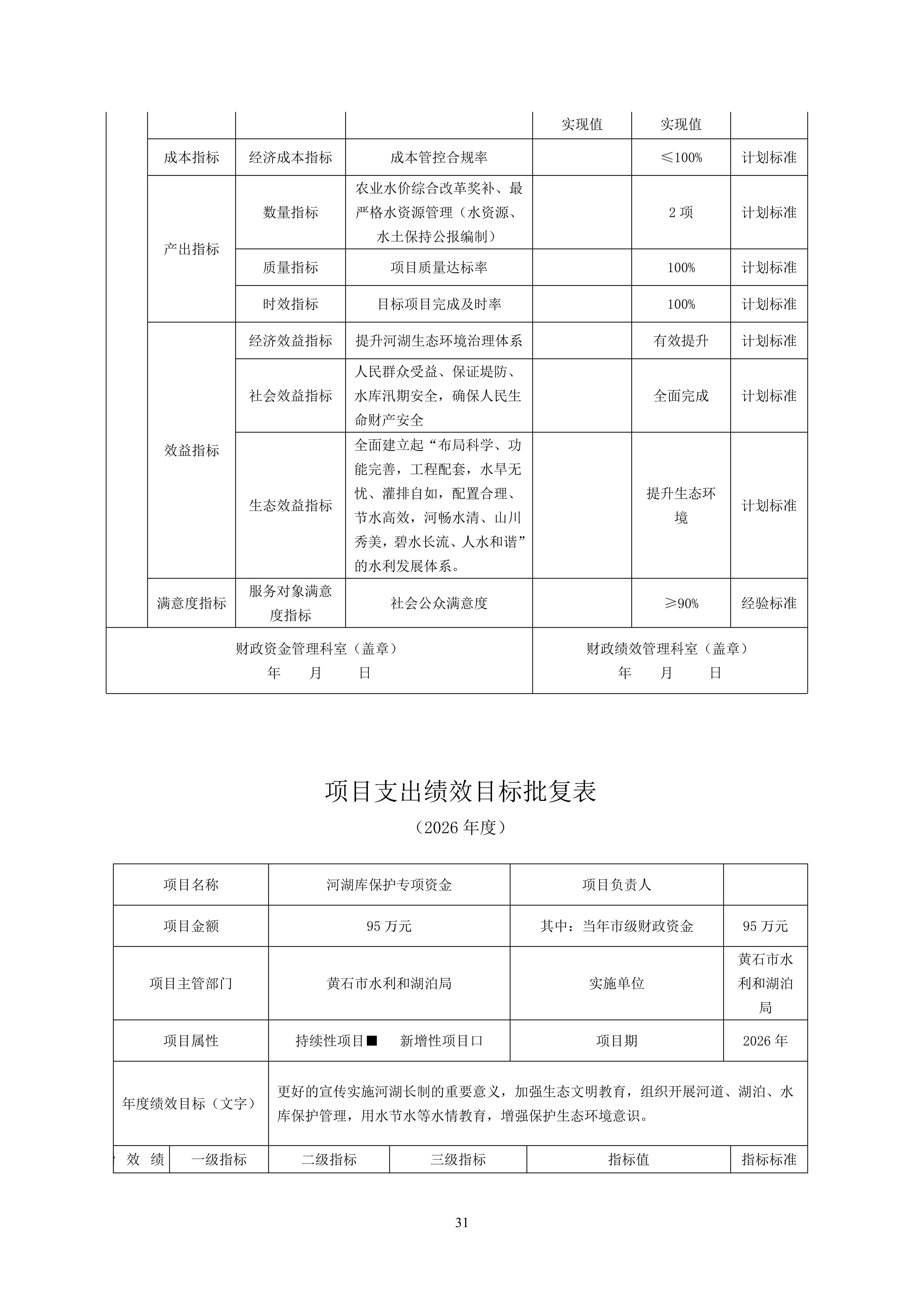 (4)实施单位:黄石市水利和湖泊局(5)项目期:一年(6)年度预算安排:2026年预算安排80万元,比上年增加80万元,增长100%。项目资金来源为当年一般公共预算财政拨款。(7)2026年度项目绩效总目标