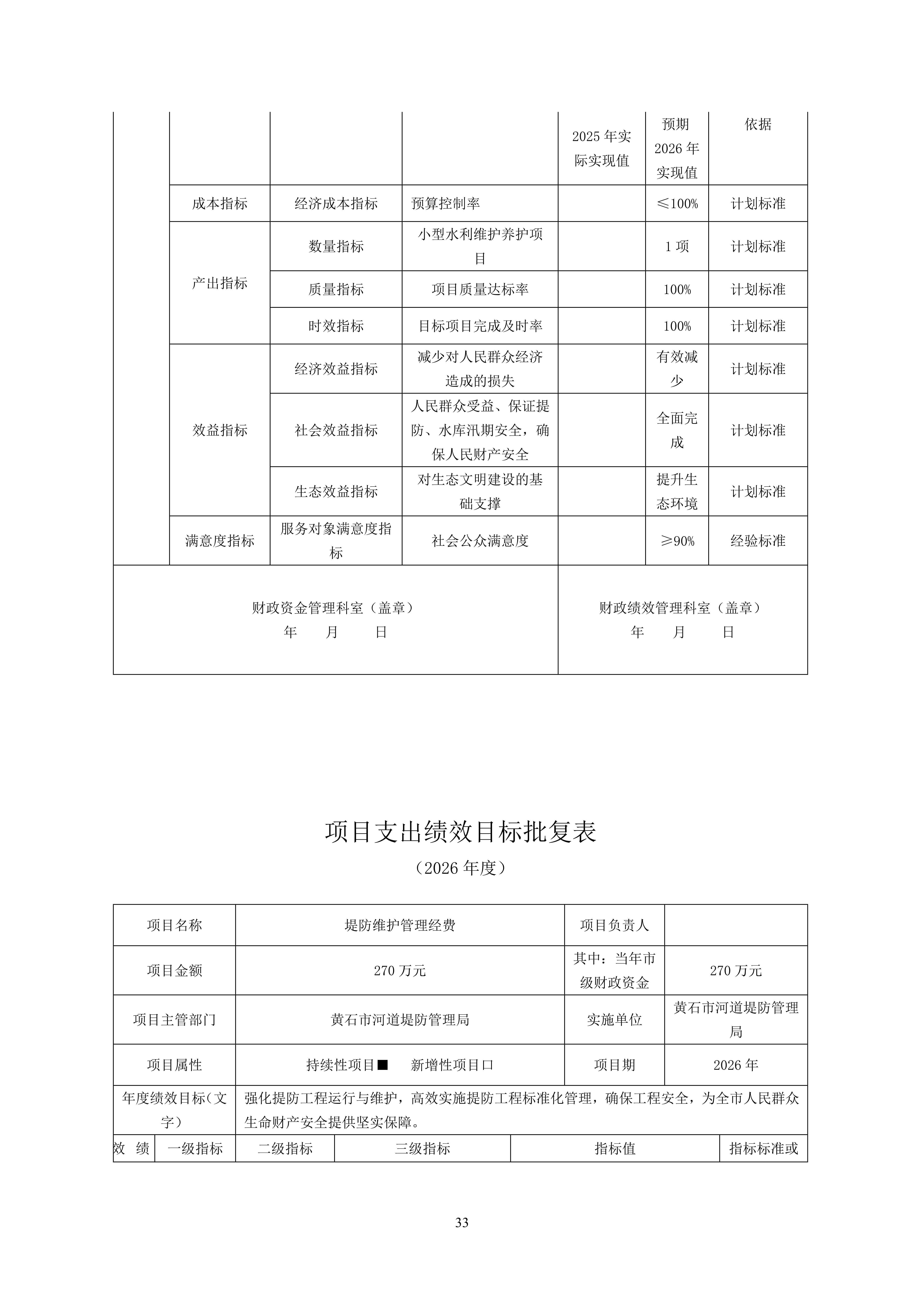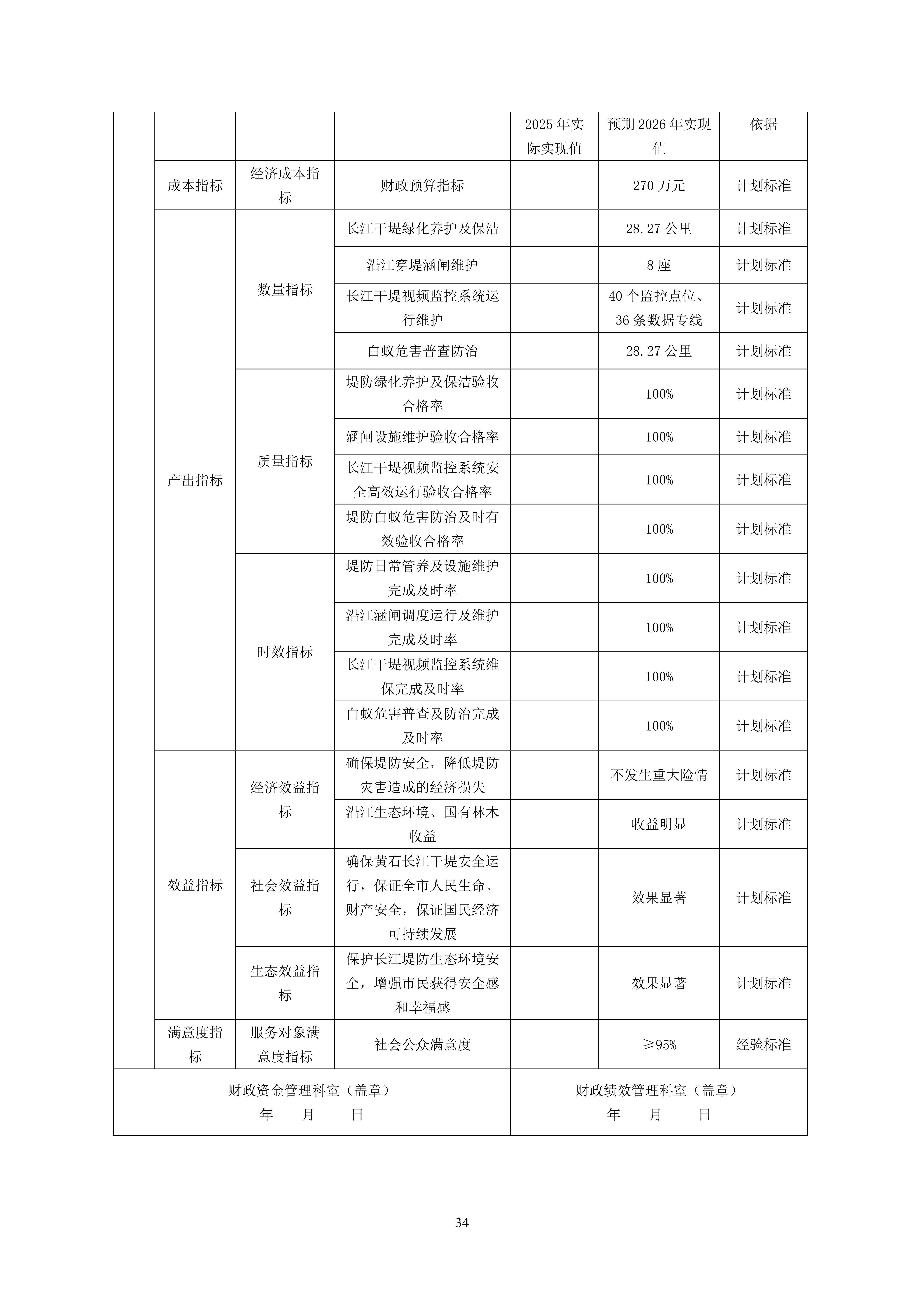 达标。效益指标:全面建立起布局科学、功能完善,工程配套的水利发展体系。满意度指标:社会公众满意度≧90%。5、堤防维护费项目。(1)项目概况:堤防维护管理费(2)项目内容:主要用于堤防日常管理、堤防维修维护、绿化管养、堤防信息化养护、长江防汛、白蚁防治等工作。(3)立项依据:堤防维护费取消(4)实施单位:黄石市河道堤防管理局(5)项目期:一年(6)年度预算安排:2026年预算安排