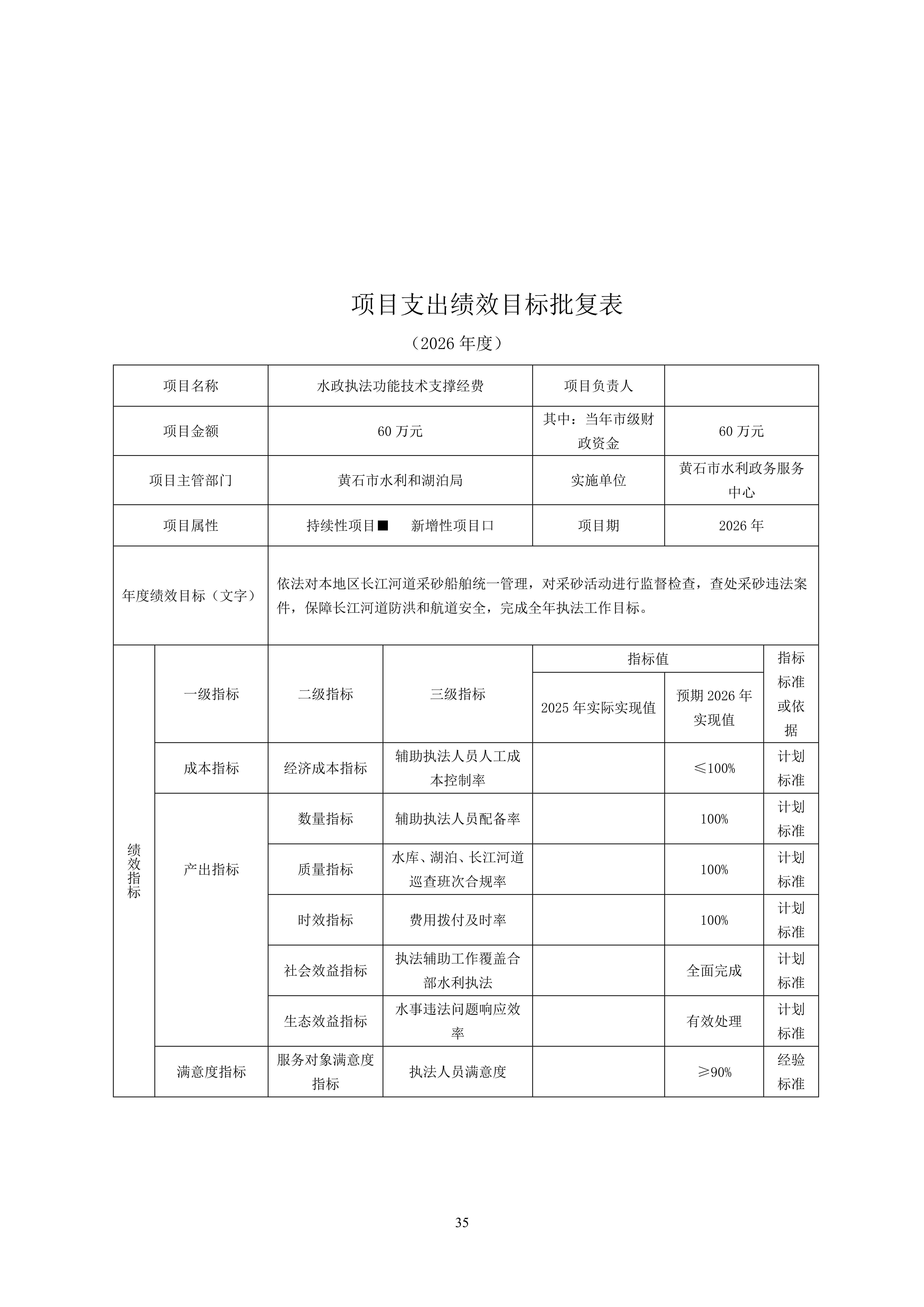 基地运行维护管理项目经费列入财政预算的请示》的意见回复,同意预算中列支执法经费。(4)实施单位:黄石市水利政务服务中心(5)项目期:一年(6)年度预算安排:2026年项目支出预算安排60万元