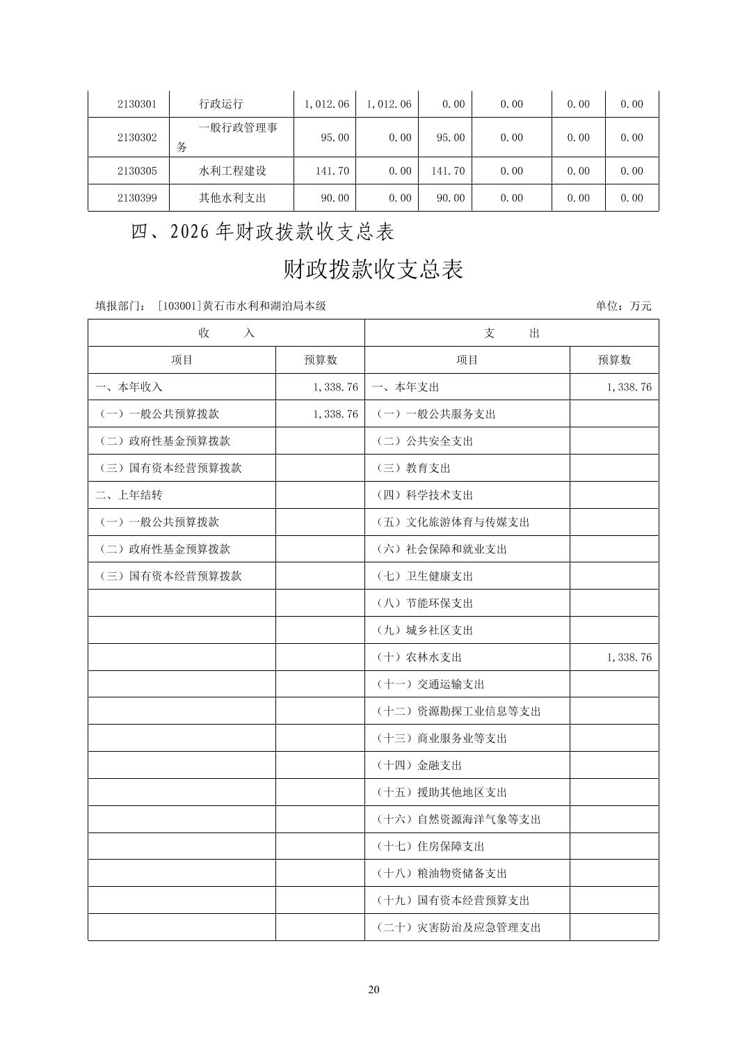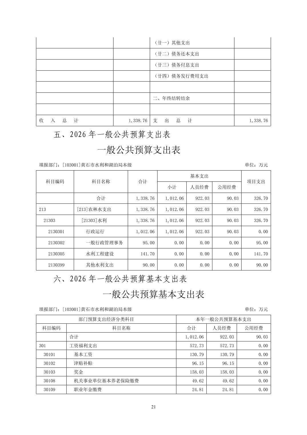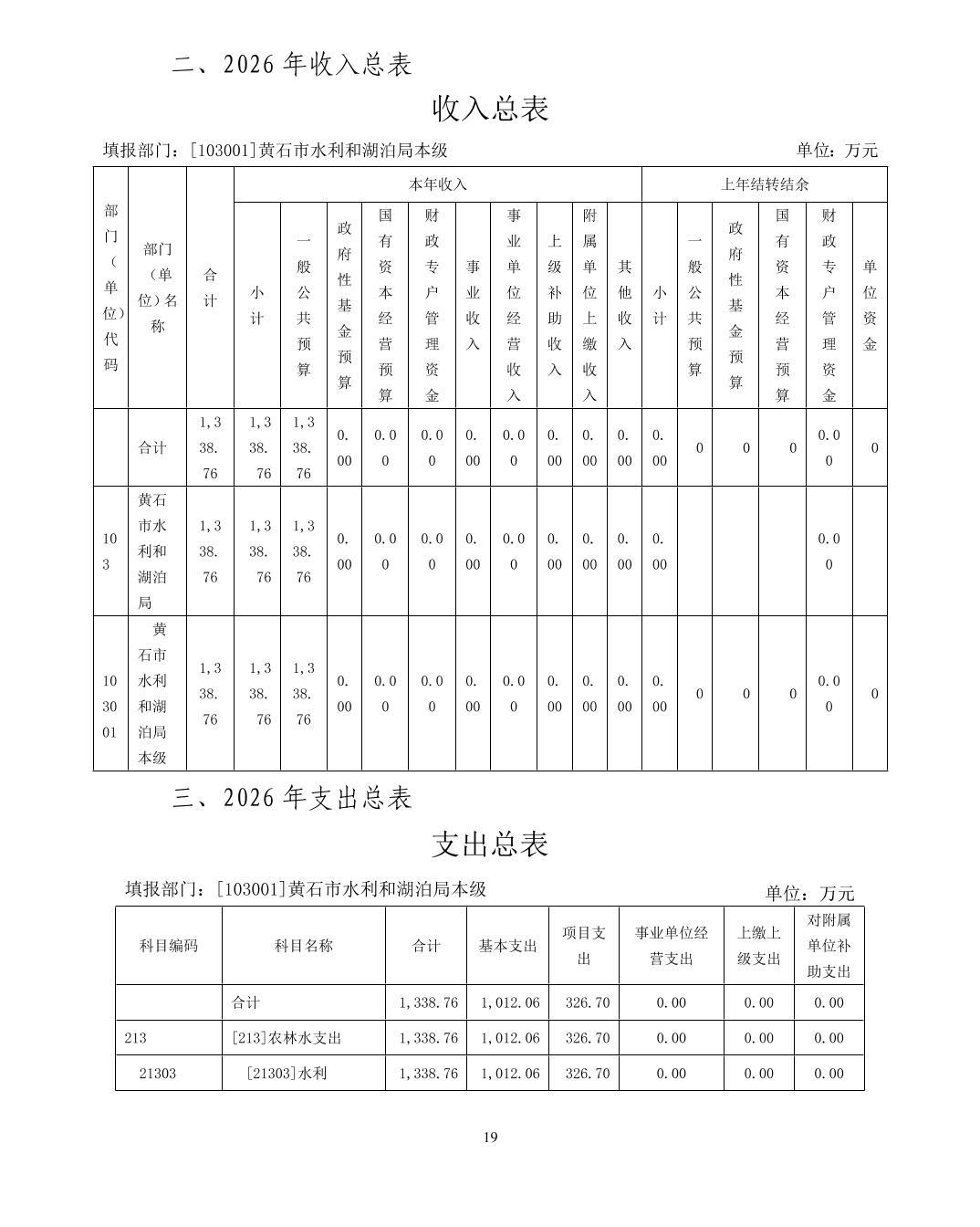 按照综合预算的原则,黄石市水利和湖泊局本级所有收入和支出均纳入部门预算管理。收入包括:一般公共预算拨款收入;支出包括:农林水支出;2026年度收支总预算1338.76万元。