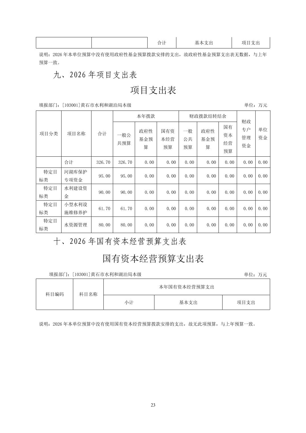 (2)农林水支出(类)水利(款)一般行政管理事务(项)2026年预算数为95万元,比上年预算增加80万元,增长84.21%。主要原因是开展对全市农村供水水质开展监测和黄石市“十四五”水安全保障规划总结评估和“十五五”水安全保障等规划编制项目。