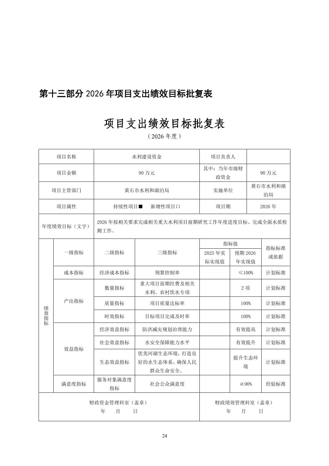 (7)2026年度项目绩效总目标是为我市有效开展自然灾害防指工作、保障经济社会可持续发展提供权威的灾害风险信息和科学决策依据。按相关要求完成相关重大水利项目前期研究工作年度进度目标、完成全面水质检测工作。