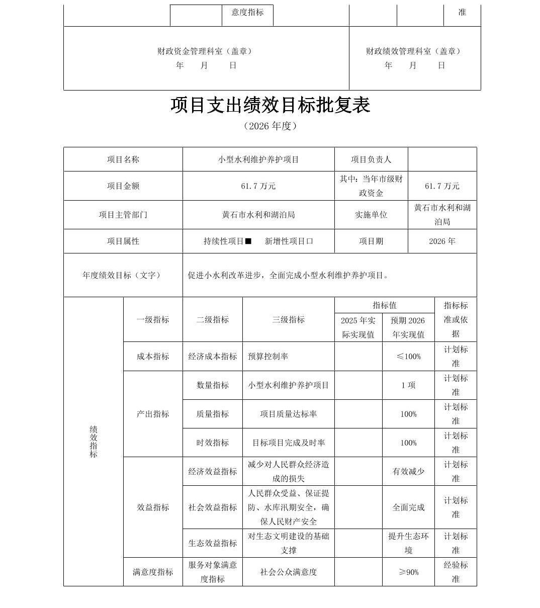 (7)2026年度项目绩效总目标通过项目实施,加大地方对小型水利工程维修养护资金,推进省级支持水利工程维修养护力度的基本需要。小型水利体制改革补助是根据政策扶持,落实到主题工程,实现每个项目有管护主体,促进小型水利体制改革进度。